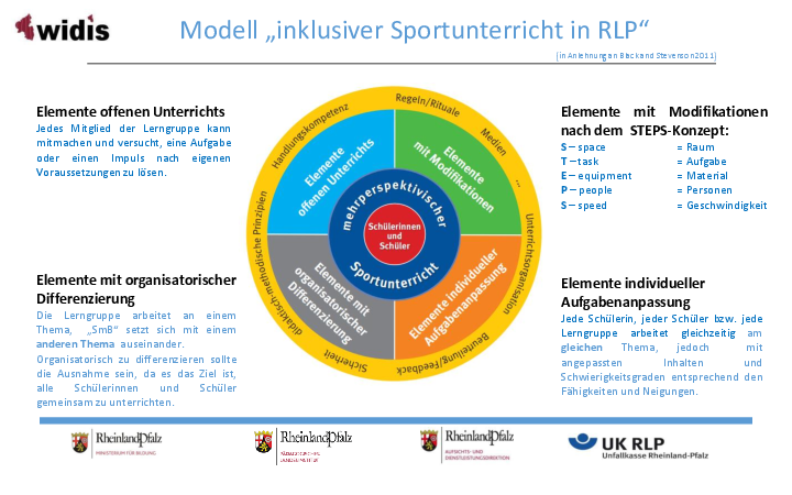 Da die Vorgaben der zum 1. August 2024 in Kraft getretenen Schulordnung für den inklusiven Unterricht an öffentlichen Schulen selbstverständlich auch im Sportunterricht zu berücksichtigen sind, möchten wir zunächst das rheinland-pfälzische Modell eines inklusiven Sportunterrichts nach dem STEPS-Konzept vorstellen. Dieses wurde im Rahmen der Qualifizierungskonzeption von WIDIS (Wege in den inklusiven Sportunterricht) in Zusammenarbeit der Schulsportreferate des Ministeriums für Bildung, der Aufsichts- und Dienstleistungsdirektion sowie des Pädagogischen Landesinstituts und der Unfallkasse entwickelt.